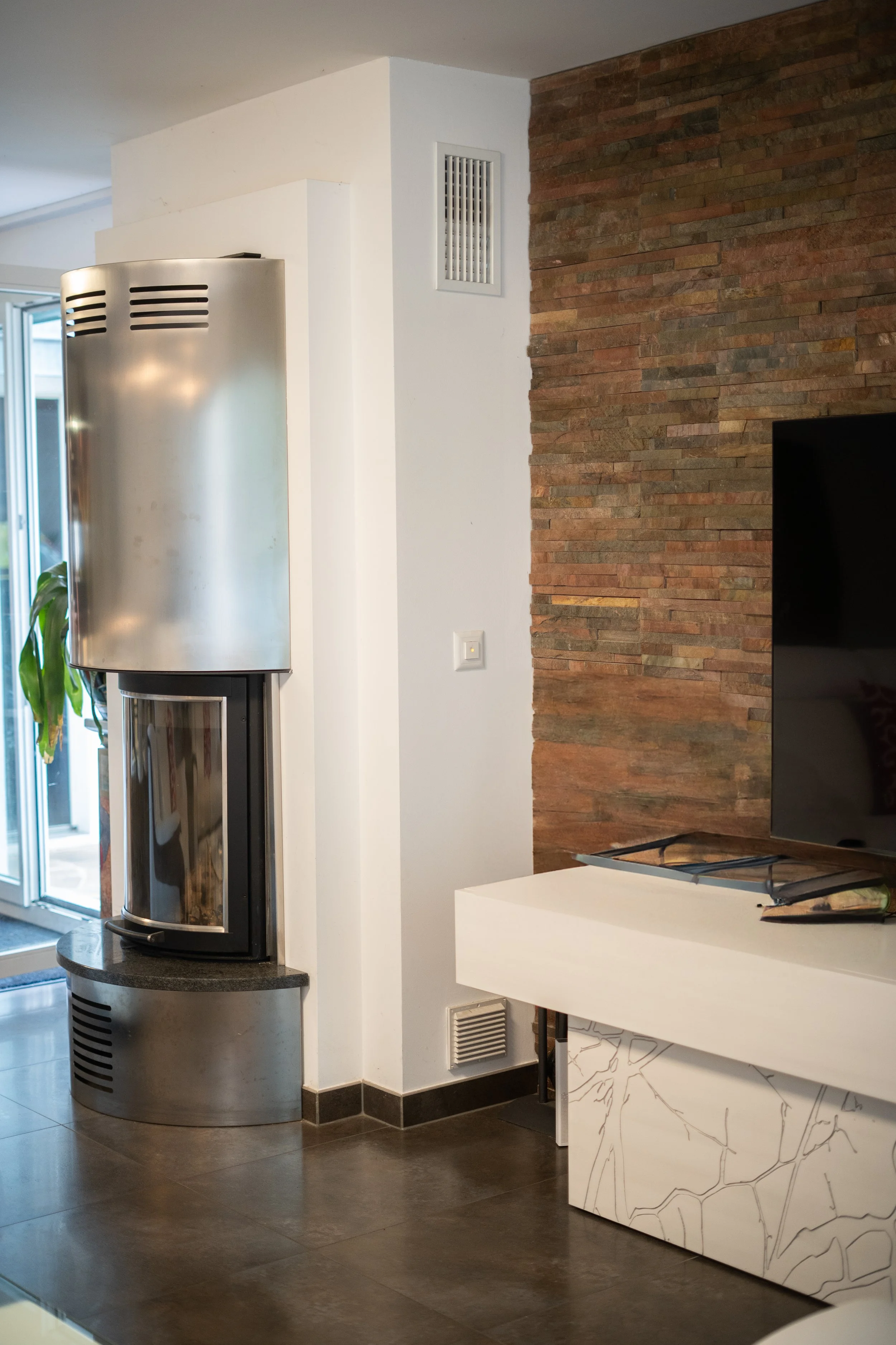 * Vaste pièce de vie de 83.80 m², composée d’un séjour lumineux avec poêle à bois et d’une cuisine entièrement équipée, ouverte et conviviale